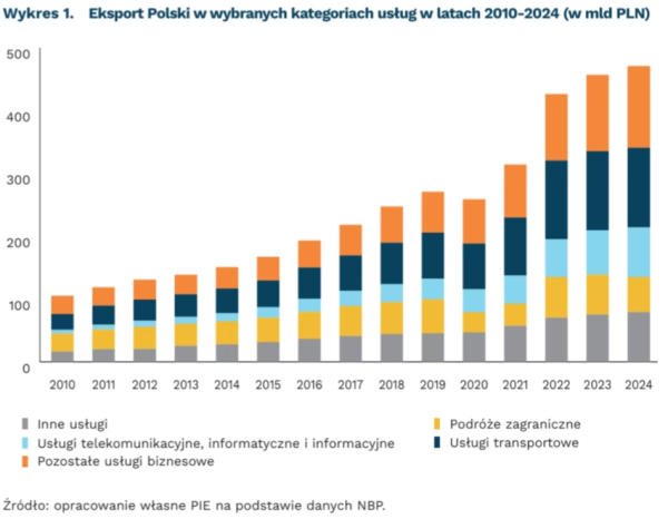 W 2024 r. spadła z kolei o 1% rok do roku wartość eksportu usług transportowych i po raz pierwszy od 2010 r. usługi transportowe nie stanowiły najliczniejszej kategorii eksportu usług z Polski – miały 27% udziału. Zdaniem Instytutu na tę sytuację wpływa dekoniunktura w Niemczech, obniżenie konkurencyjności cenowej spowodowane rosnącymi kosztami pracy i deficytem pracowników w sektorze transportowym w Polsce. Największy udział w eksporcie mają z kolei inne usługi biznesowe – 28% w 2024 r., a usługi telekomunikacyjne, informatyczne i informacyjne – 17%. Postęp tej kategorii w ujęciu rocznym wyniósł 11% – zaznaczono w publikacji.