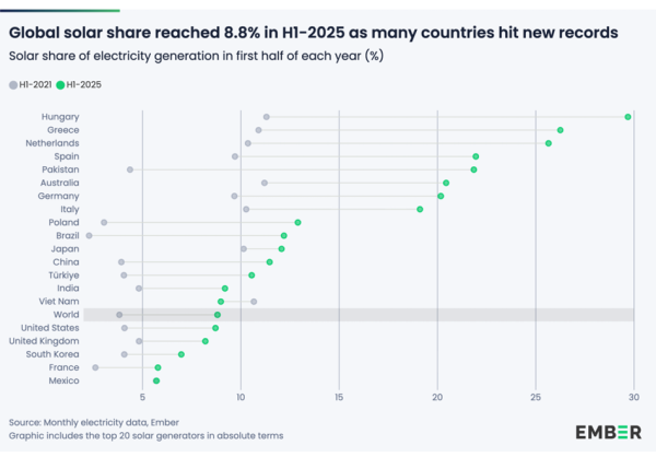 Think tank oznajmił, że za ogólnoświatowy wzrost generacji energii słonecznej odpowiadają w 55 proc. Chiny, a następnie USA – 14 proc., kraje tworzące Unię Europejską – 12 proc., Indie – 5,6 proc. i Brazylia – 3,2 proc.