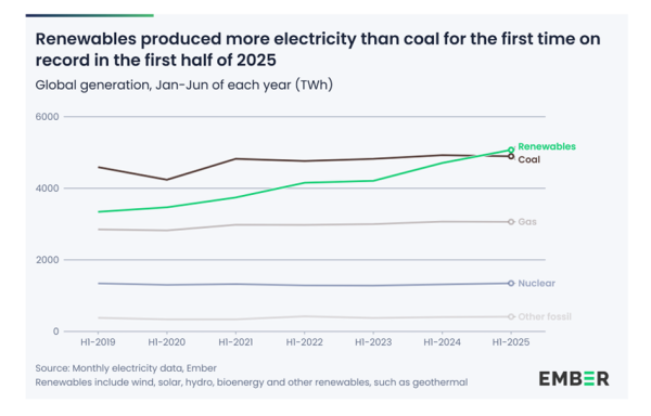 W pierwszej połowie roku 2025 farmy solarne i wiatrowe wygenerowały globalnie więcej energii niż elektrownie węglowe – poinformował we wtorek „Guardian”, powołując się na raport brytyjskiego ośrodka analitycznego Ember, który zajmuje się zagadnieniami klimatycznymi.