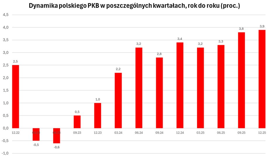 Eksperci z Santander Bank Polska wskazują, że wzrost inwestycji nabierze tempa w 2026 roku, co powinno pozwolić na utrzymanie dynamiki PKB w okolicach 4%. Z kolei analitycy ING Banku Śląskiego prognozują jedynie niewielkie przyspieszenie dynamiki PKB w 2026 roku, do poziomu 3,7%. Spodziewają się, że wzrost spożycia gospodarstw domowych przekroczy 3%, pomimo wyraźnego spowolnienia dynamiki dochodów do dyspozycji. **Czytaj również:** Kryzys strategicznego dla Polski sektora. Tysiące miejsc pracy zagrożonych Dziękujemy, że przeczytałaś/eś nasz artykuł do końca. Bądź na bieżąco! Obserwuj nas w Google. — ### Wyniki Biznes Fakty: Dobre wyniki gospodarcze, szczególnie wzrost PKB i konsumpcji, oznaczają potencjalnie lepszą koniunkturę dla przedsiębiorców. Silniejszy popyt konsumencki może przełożyć się na zwiększone obroty firm, a rosnące inwestycje wskazują na optymizm biznesu i potencjalne nowe możliwości rozwoju, tworzenie miejsc pracy oraz innowacje. Dla konsumentów może to oznaczać stabilniejszą sytuację na rynku pracy i potencjalny wzrost wynagrodzeń w dłuższej perspektywie.