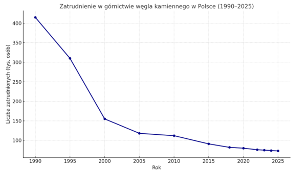 Zatrudnienie w polskim górnictwie, a zwłaszcza w dziedzinie pozyskiwania węgla kamiennego, od przeszło trzech dekad systematycznie się kurczy. Niegdyś, w początkowym okresie lat 90. XX wieku, pracowało tam więcej niż 400 tysięcy osób. Był to okres, kiedy ten obszar stanowił jeden z fundamentów polskiej ekonomii, a Śląsk był centrum przemysłowym państwa.