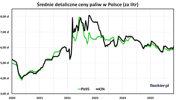 Mimo ostatnich podwyżek, notowania paliw są wciąż nieco niższe od tych, które obserwowaliśmy rok temu. Średnia cena detaliczna benzyny Pb95 jest nadal o 15 gr/l niższa niż w roku poprzednim, natomiast oleju napędowego jedynie o 4 gr/l. Autogaz jest znacznie tańszy niż na początku listopada 2024 roku, a tankujemy go średnio o 46 gr/l taniej.
