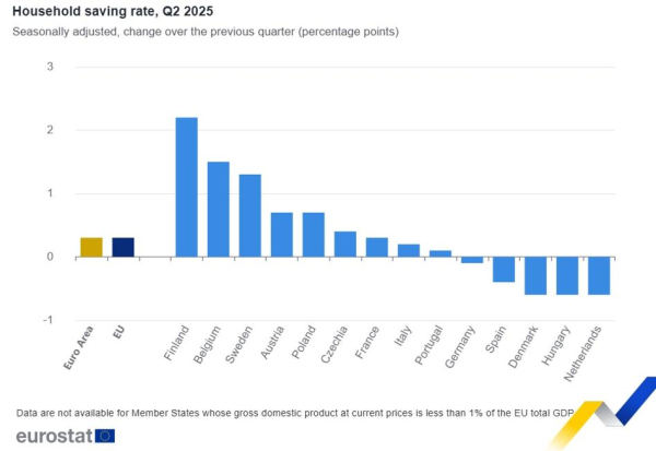 W drugim kwartale 2025 roku wskaźnik odkładania aktywów przez gospodarstwa domowe w strefie euro i UE wzrósł o 0,3 punktu procentowego (pp). Polska pokazała większy progres tego wskaźnika, o +0,7 pp.