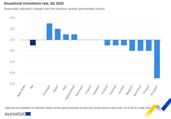 Oznacza to, że proporcjonalnie mniejsza część zysku gospodarstw domowych została alokowana na inwestycje (np. w nieruchomości) niż w poprzednim kwartale. Jest to symptom niepokojący w aspekcie długotrwałego postępu. Wzrost inwestycji zanotowano między innymi w Portugalii (+0,3 pp) i Hiszpanii (+0,2 pp), a największy spadek nastąpił na Węgrzech (-0,7 pp).