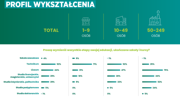 W publikacji dodano, że osoby z wyższym wykształceniem częściej spotykane są wśród właścicieli większych przedsiębiorstw – w mikrofirmach dyplom studiów licencjackich lub magisterskich posiada zaledwie 18% szefów, a inżynierskich – 9%. W firmach średniej wielkości te wskaźniki są ponad dwukrotnie wyższe (odpowiednio 44% i 52%). Autorzy badania zwracają uwagę, że co trzeci właściciel firmy średniej wielkości ma również ukończone studia podyplomowe, podczas gdy w mikrofirmach „jest to wciąż zjawisko rzadkie”.