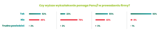 „Znaczenie wykształcenia w codziennym zarządzaniu firmą jest oceniane różnie. Niewiele ponad połowa ankietowanych przedstawicieli MŚP (52%) uważa, że ukończenie studiów wyższych ułatwia im codzienne prowadzenie własnej działalności gospodarczej. Z drugiej strony, 46% respondentów twierdzi, że nie ma ono większego wpływu. Ponownie, większą wartość dyplomu dostrzegają właściciele firm średniej wielkości (92% pozytywnie ocenia wpływ edukacji), podczas gdy w mikrofirmach tylko 22% podziela tę opinię” – wynika z raportu.