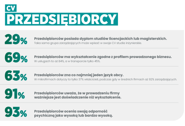 „Wśród właścicieli firm, 29% posiada dyplom licencjata lub magistra, analogiczny odsetek ukończył studia inżynierskie. Oznacza to, że 42% osób zarządzających polskimi małymi i średnimi przedsiębiorstwami nie ma ukończonych studiów wyższych. Jeszcze mniej rozpowszechnione są studia podyplomowe, którymi w swoim życiorysie zawodowym może pochwalić się jedynie 11% liderów MŚP, zaś tytuł doktora posiada zaledwie 1% właścicieli firm” – dowiadujemy się z raportu z badania „Pod lupą”, przygotowanego na zlecenie EFL.