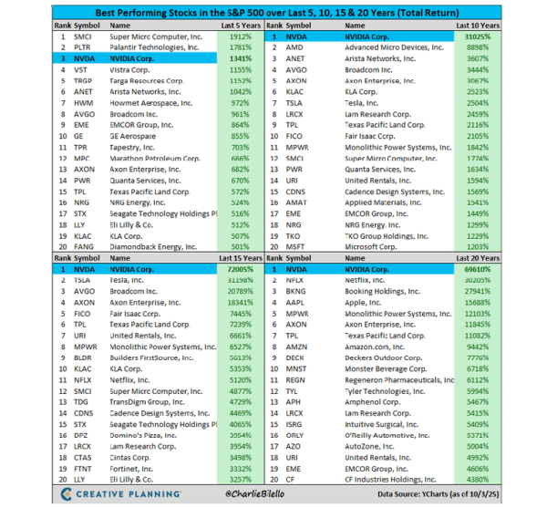 Inwestycja w akcje Nvidii 10 lat temu zaowocowałaby całkowitym zyskiem na poziomie przeszło 31 tys. procent na początku października 2025 r. Lider rewolucji AI i związanej z nią hossy bezdyskusyjnie zwycięża w zestawieniach dotyczących najbardziej rentownych akcji w S&P500 w prawie wszystkich dłuższych perspektywach czasowych – z wyjątkiem ostatnich 5 i 30 lat.