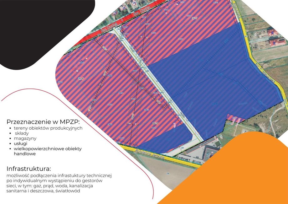 Kompleks nieruchomości tworzą trzy parcele o regularnych kształtach, mające dostęp do utwardzonych dróg publicznych i dróg gminnych. Co istotne, dla terenu obowiązuje także plan zagospodarowania przestrzennego, jaki wyznacza obszar pod zakłady wytwórcze, składowiska, magazyny, usługi i wielkopowierzchniowe obiekty handlowe.