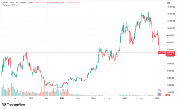 W nocy z 5 na 6 lutego wartość bitcoina zeszła do 60 tys. dolarów, co stanowiło poziom o ponad 50% niższy od maksimum z 6 października 2025 roku, kiedy to wyceny BTC ustanowiły historyczny rekord na pułapie 126 tys. dolarów.