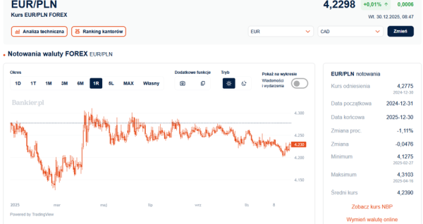 We wtorek o godzinie 9:40 za jedno euro płacono 4,2289 zł, czyli analogicznie jak dzień wcześniej, kiedy to wspólna waluta zyskała na wartości o więcej niż grosz. Notowania euro wzrastają od początku minionego tygodnia, po tym jak wcześniej ulokowały się najniżej od kwietnia, spadając w okolice poziomu 4,20 zł.